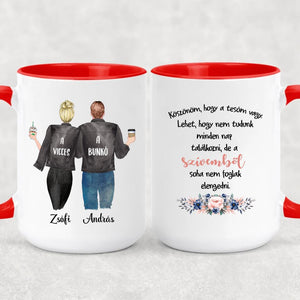 A bögre egyik oldalán a karakterek, míg a másik oldalán a kiválasztott idézet szerepel.