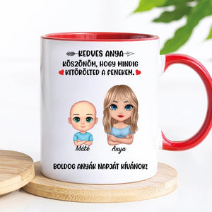 A bögre egyik oldalán a karakterek, míg a másik oldalán a kiválasztott idézet szerepel.