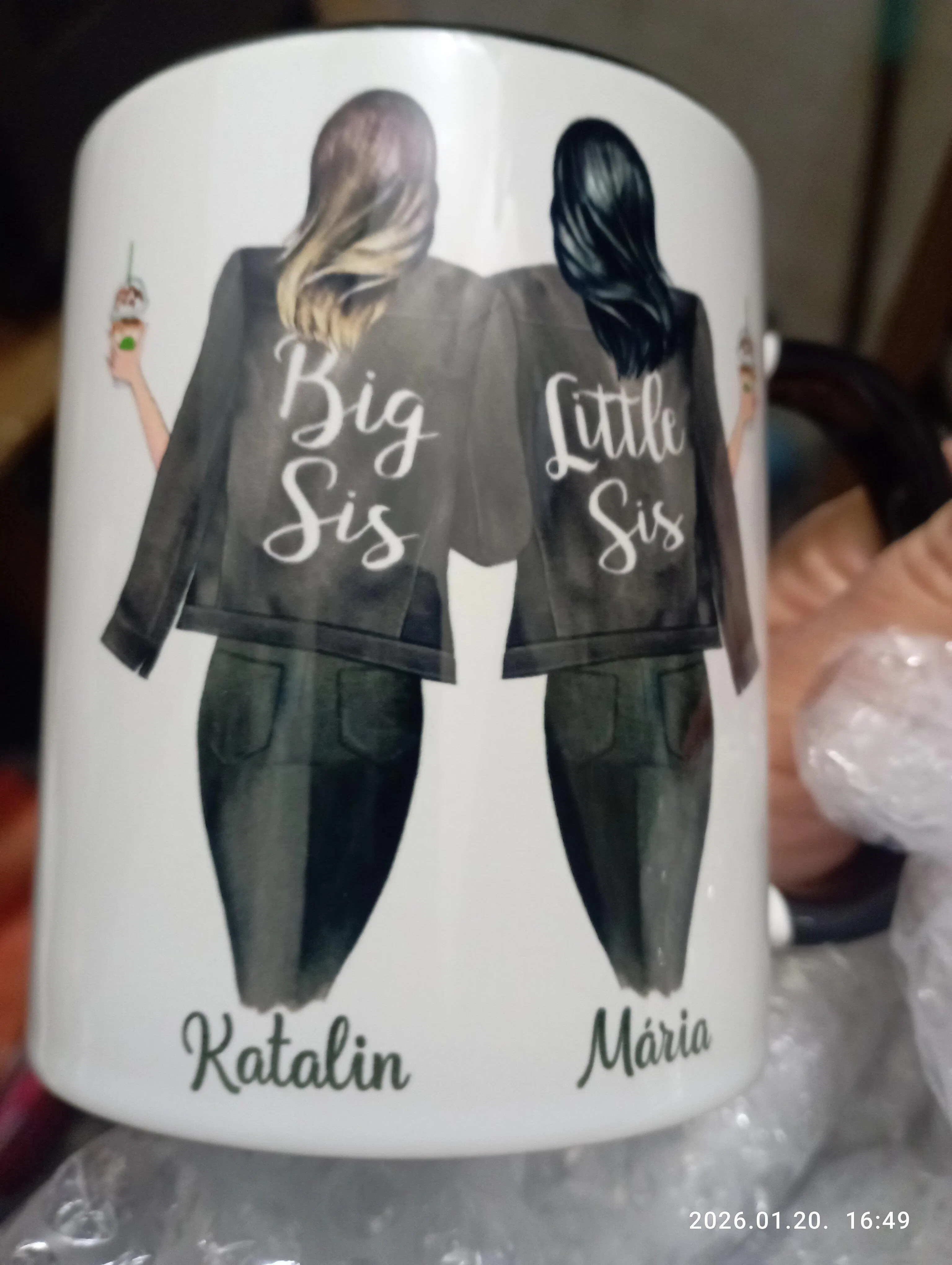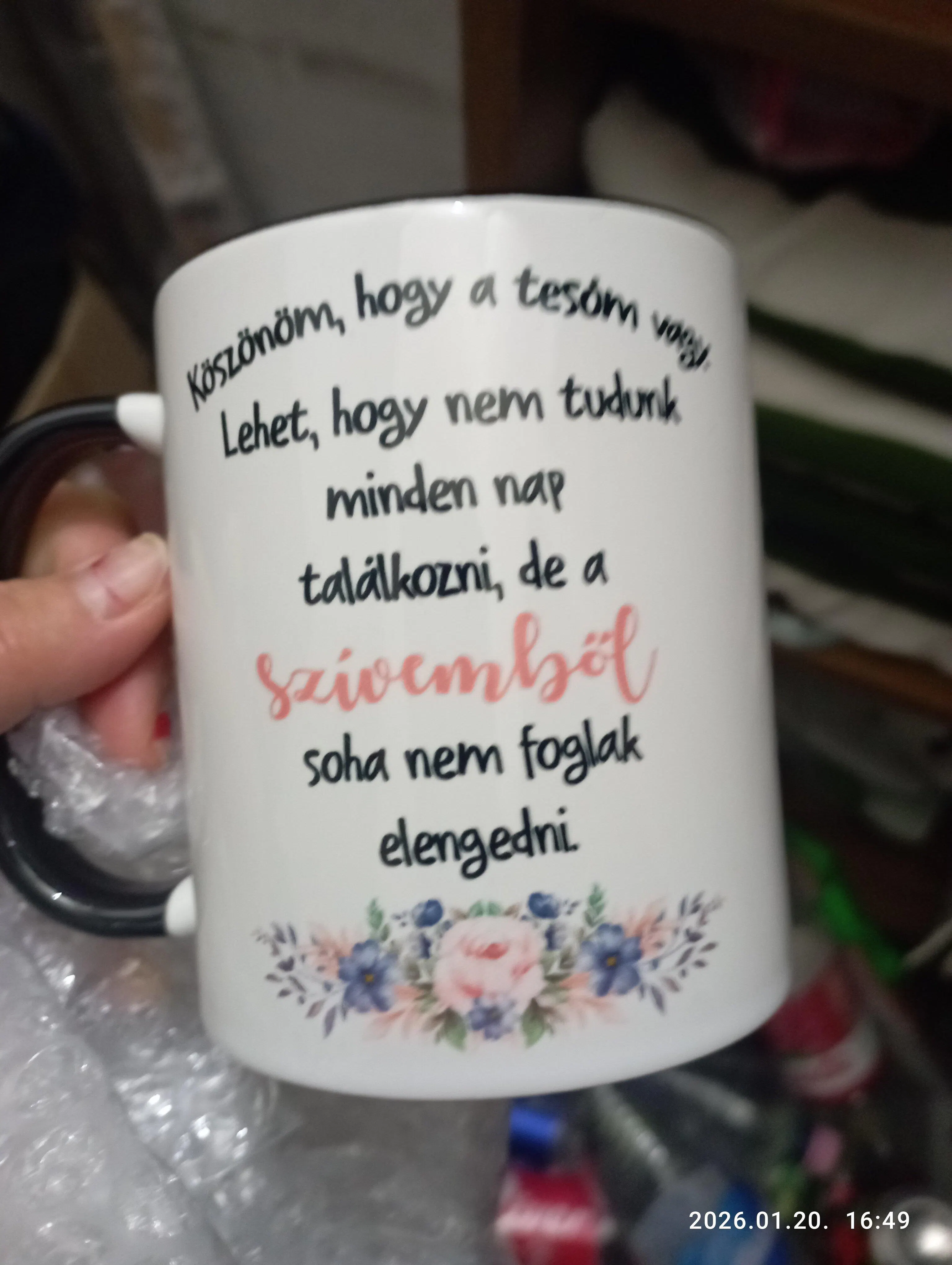 A bögre egyik oldalán a karakterek, míg a másik oldalán a kiválasztott idézet szerepel.