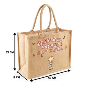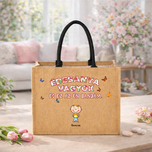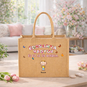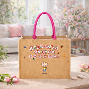 Ez az egyedi, vidám grafikával díszített juta táska minden büszke édesanya szívét megdobogtatja. A mosolygó gyermekfigurák és az „Édesanya vagyok és ez az én bandám” felirat szeretetteljes, játékos hangulatot sugároz, miközben igazán személyes és különleges kiegészítővé teszi a táskát.