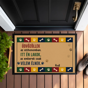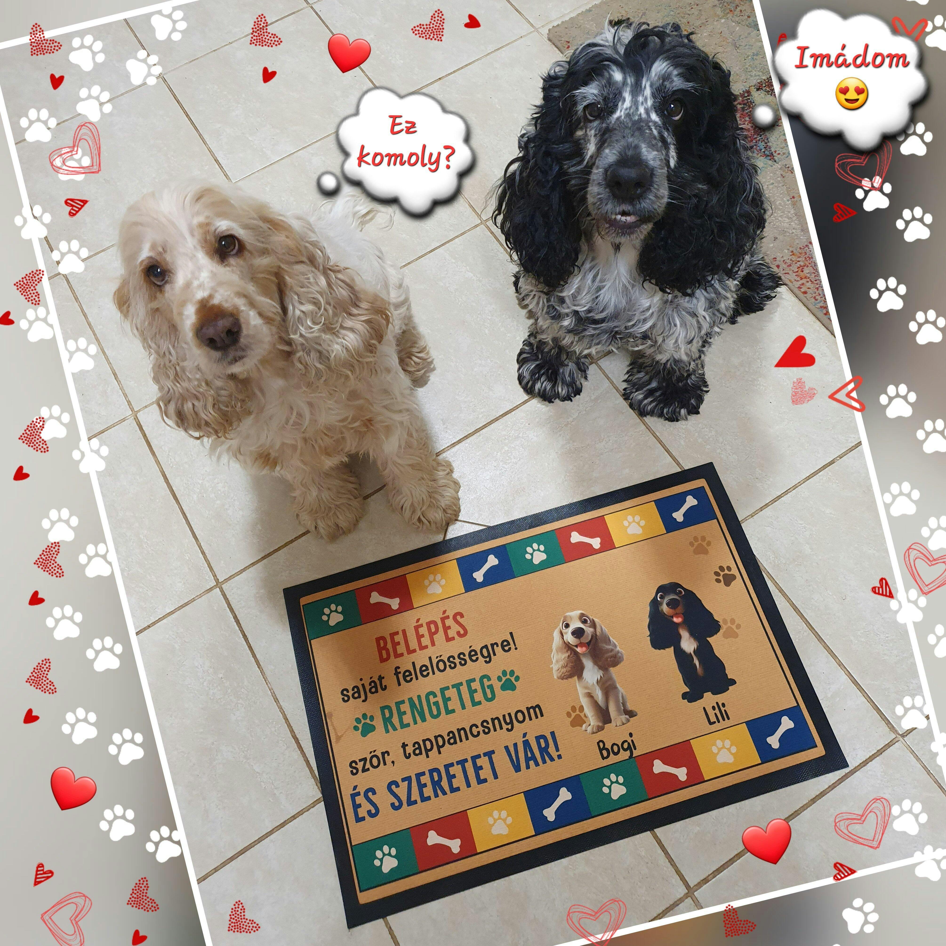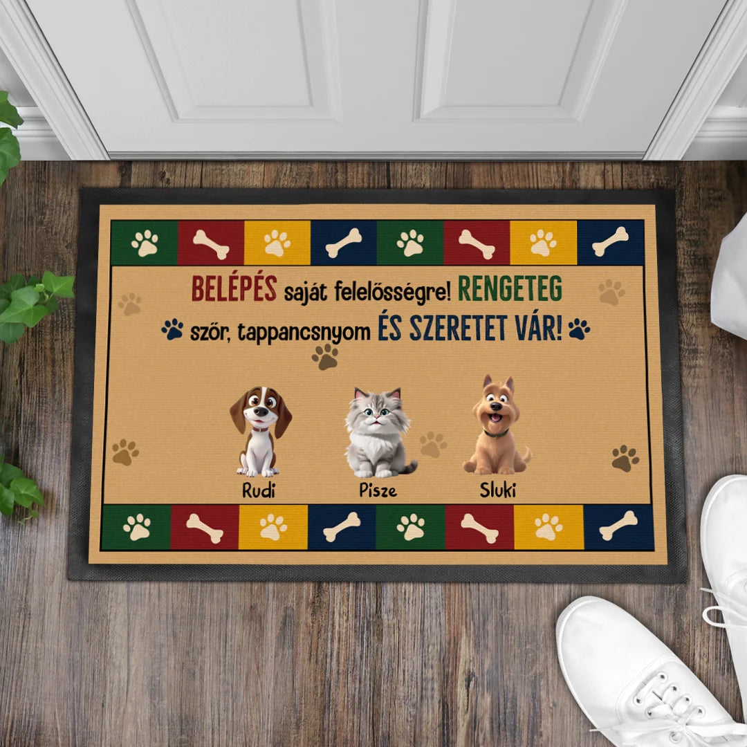 A lábtörlőre szövegeket és neveket is írhatsz, teljesen személyre szabhatod. Kiválaszthatod a karaktereket, és tetszés szerint alakíthatod a megjelenésüket. Hozzáadhatod a házi kedvencek nevét is, többféle kutya- és macskafajta közül választhatsz. Akár több alakot és karaktert is elhelyezhetsz a lábtörlőn, és különböző hátterek közül választhatsz.