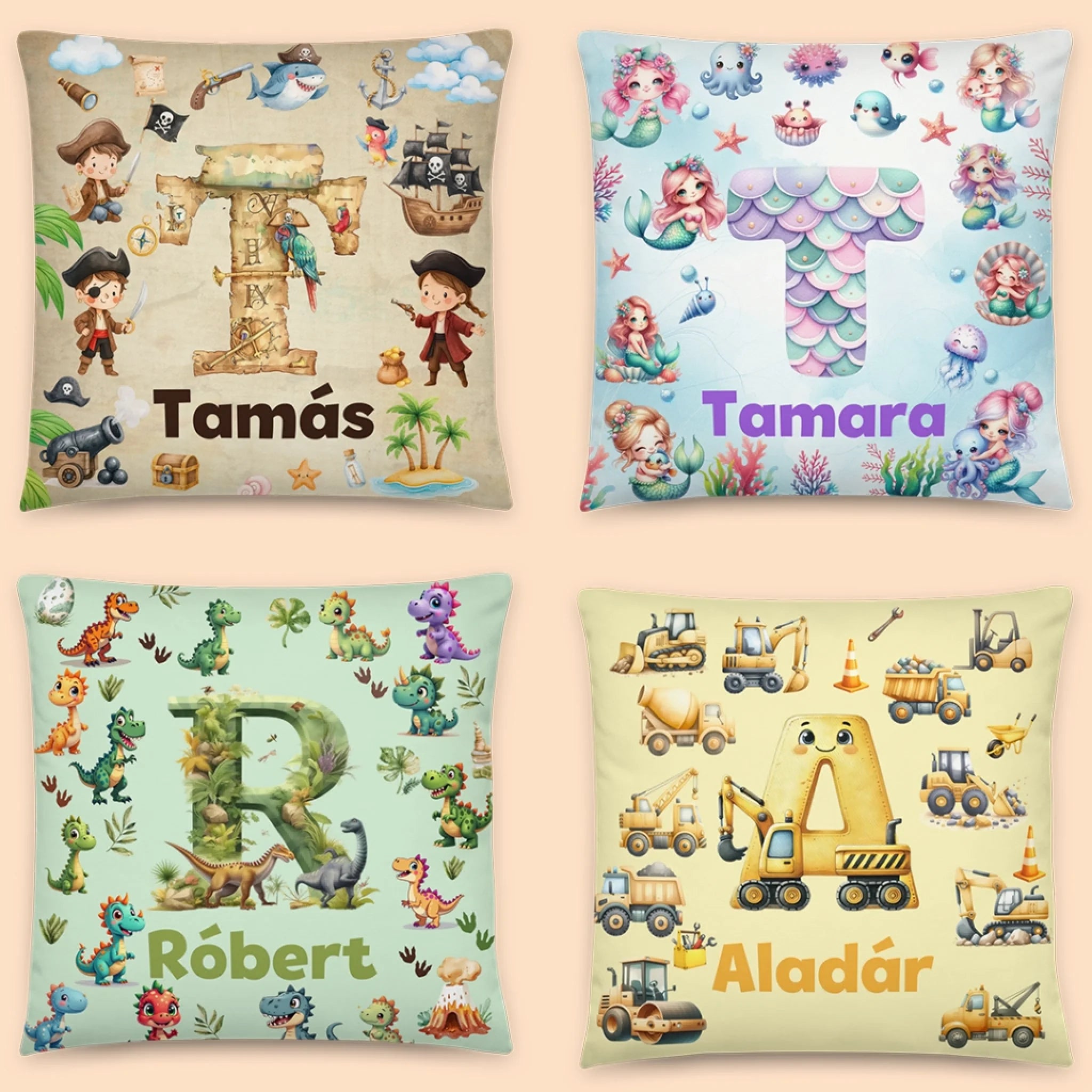 Varázslatos ajándék gyerekeknek! Lepd meg gyerkőcöd egy személyre szabott, névre szóló párnával, melyet kifejezetten Neki készítünk! Válassz hátteret (kalózos, sellős, dinoszauruszos vagy munkagépes...stb.), add meg a nevet és a kezdőbetűt – így lesz igazán személyes és különleges. Puha, mosható huzattal és élénk színekkel készítjük, hogy igazi dísze legyen a gyerekszobának.