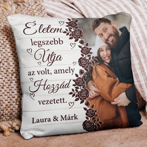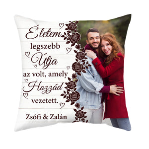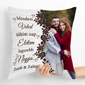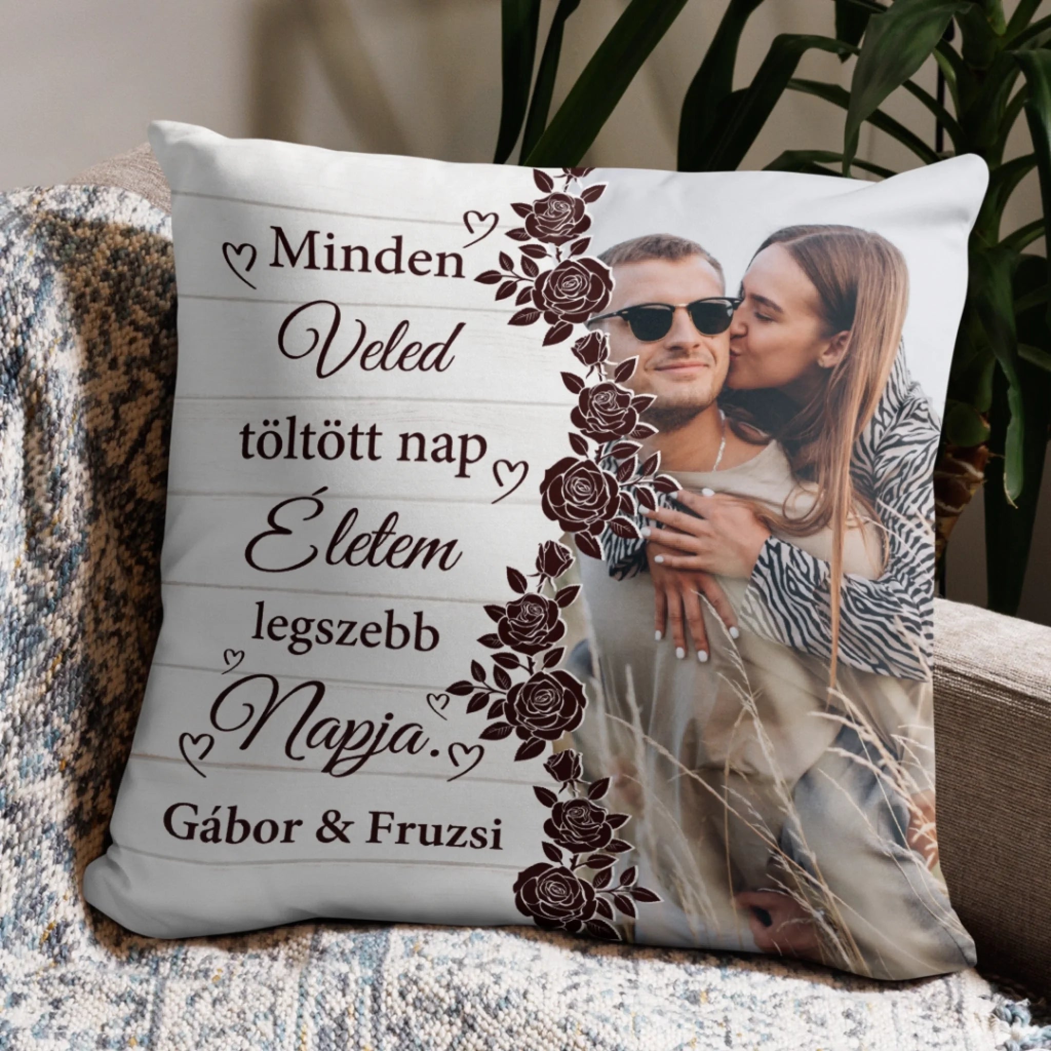 Romantikus egyedi párna pároknak – saját fotóval és névvel tervezve, szívhez szóló ajándék minden alkalomra.