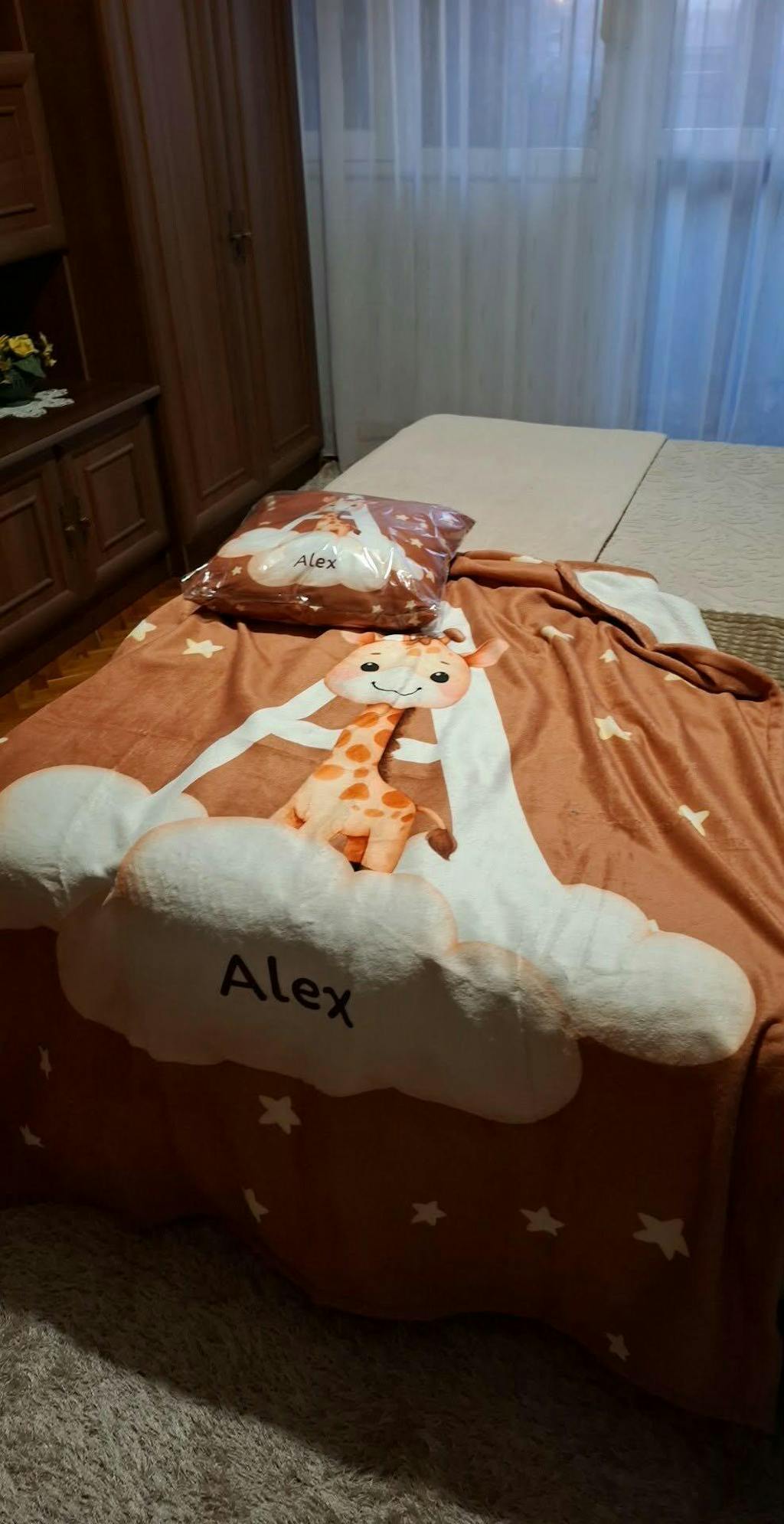 Puha, személyre szabott takaró aranyos állatkás mintával, felhőn ülve, csillagokkal körülvéve. Tökéletes ajándék gyerekeknek – a pléden szerepelhet a gyermek neve és kezdőbetűje is. Meleg, kellemes tapintású anyagból készült, ideális bekuzkózós estékhez vagy délutáni pihenéshez.
